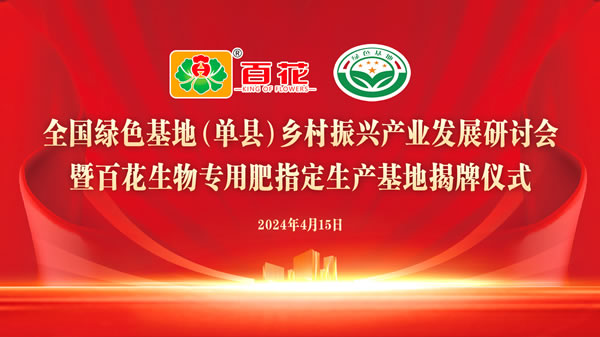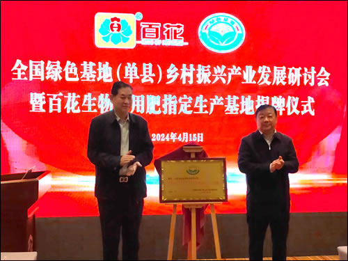 2024年4月15日,全國綠色基地(單縣)鄉(xiāng)村振興產(chǎn)業(yè)發(fā)展研討會在單縣中領國際酒店召開,同時為山東百花生物集團有限公司舉行“全國綠色農(nóng)業(yè)產(chǎn)業(yè)專用肥指定生產(chǎn)基地”揭牌儀式。
